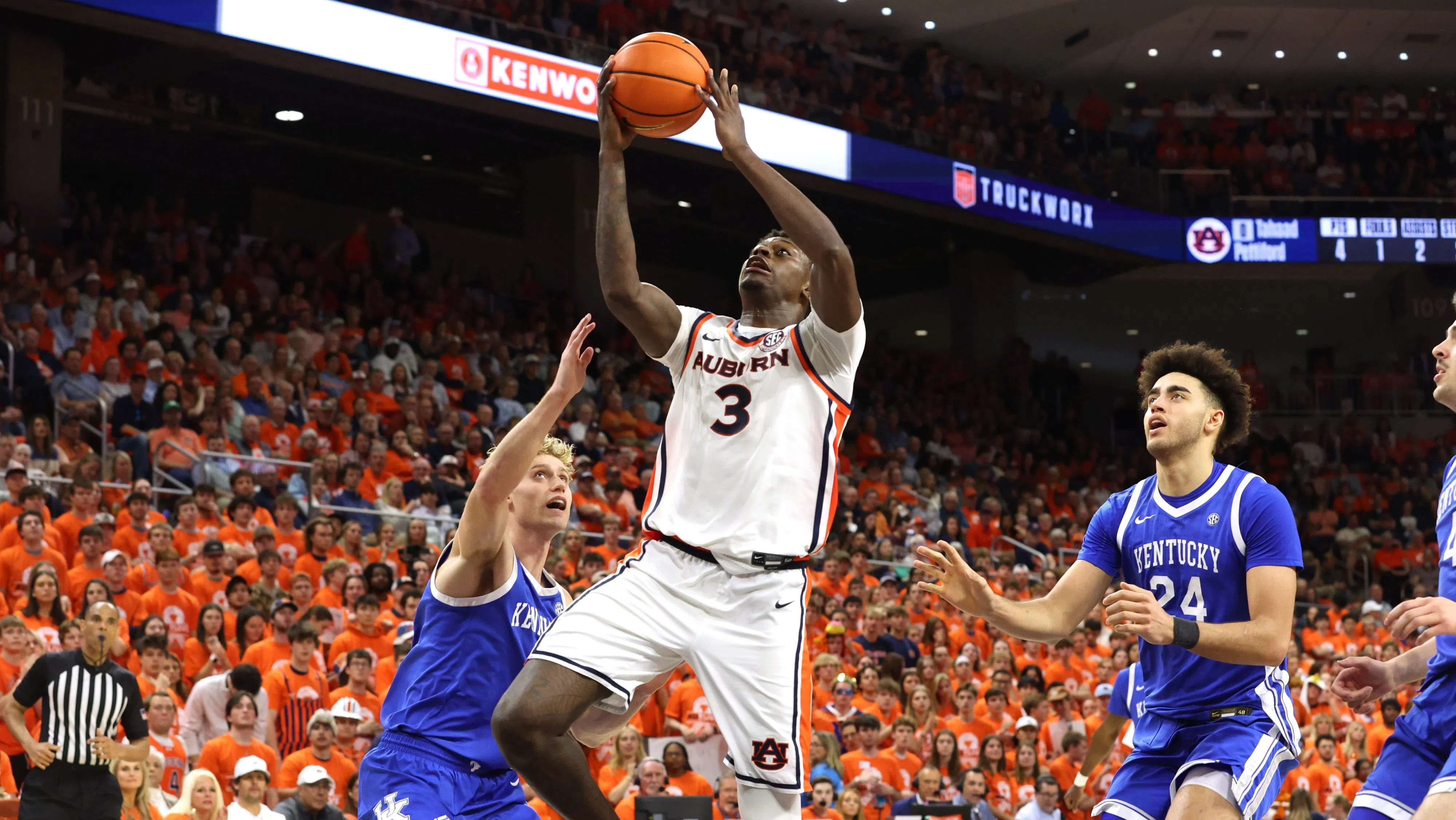 Auburn carried a one point lead late in the second half, but got sloppy in the final minute, losing two turnovers that allowed Kentucky to take a 74-73 lead with 15 seconds left. While inbounding the ball with the one point lead, Kentucky was whistled for a push off giving the ball back to the Tigers. On the ensuing play, Keyshawn Hall’s missed jumper led to a put back dunk from Elyjah Freeman with 1.2 seconds left. Auburn scored back-to-back wins against the Cats for the first time in six years and just the second time in 36 years.